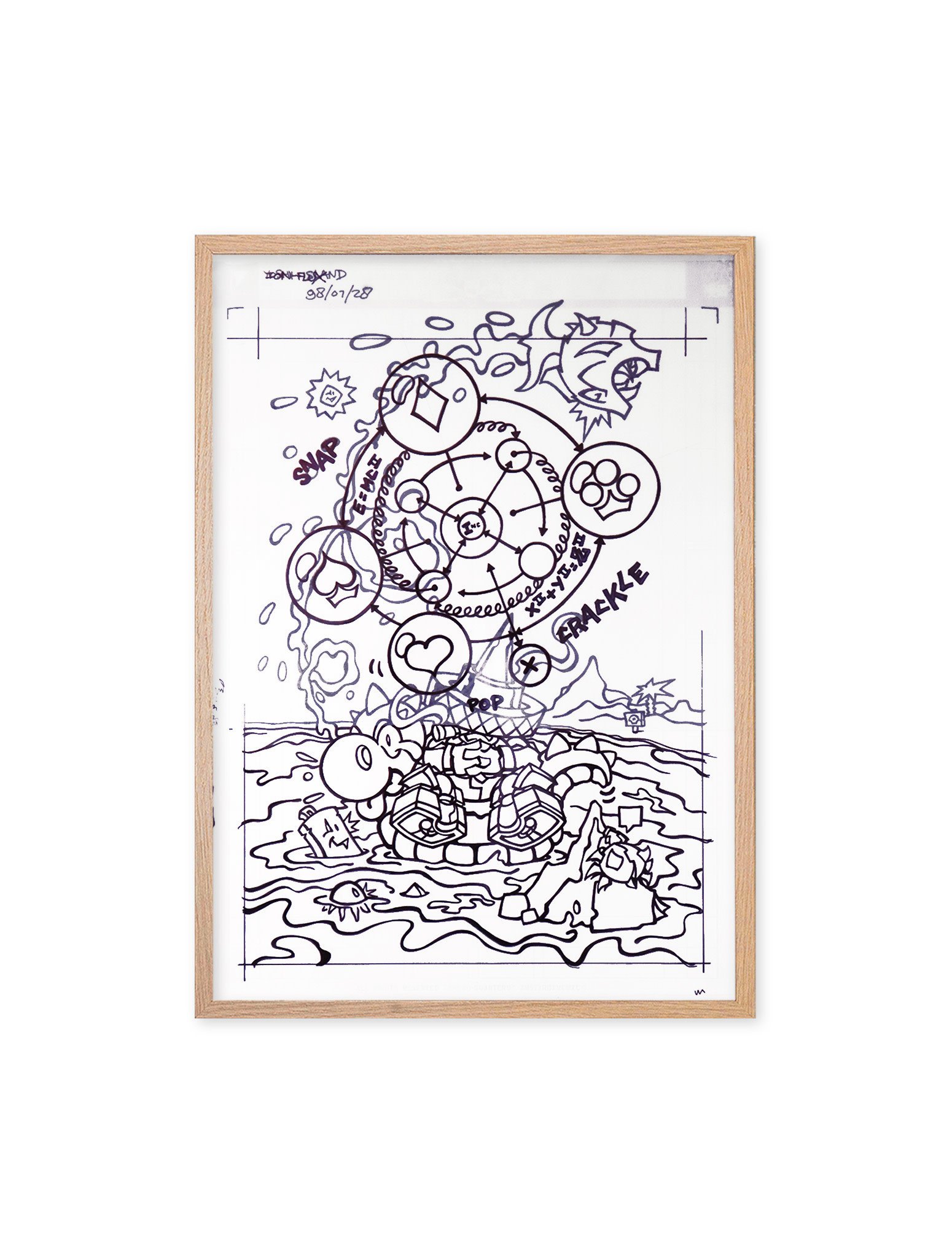 Original drawing by Dutch artist Angel (TBH GVB CTK), created in 1998. He drew his work, titled "Ion Flux" with a marker on two layers of special paper, measuring 38 x 53 cm. The artwork comes in a natural wood colored frame, included in the price.