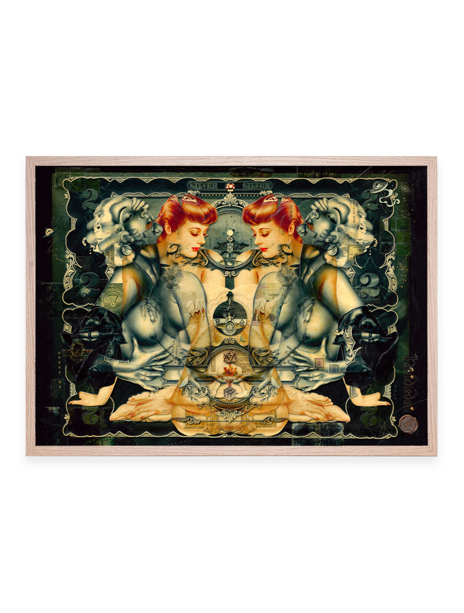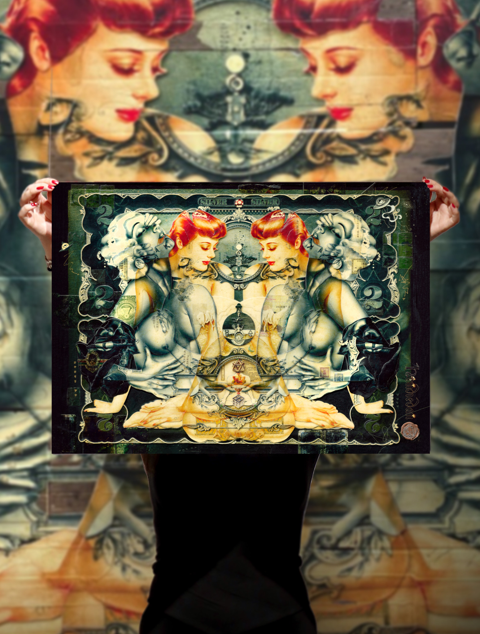 Het werk van Handiedan is een complexe mix van knip-en-plakwerk en digitale en gedetailleerde met de hand gesneden beeldhouwcollages, aangevuld met augmented reality en verzamelde antieke sierlijsten.